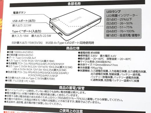 5,000mAhはUSB Type-Cポート搭載で、最大出力は22.5W。10,000mAhはUSB Type-AとUSB Type-Cの2ポート搭載で、最大出力はいずれも22.5W(同時出力時は合計15W)。