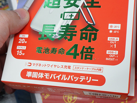 充放電サイクル寿命約2,000回で、寒さ・暑さに強いというエアージェイの「マグネットワイヤレス充電対応 スタンド+ケーブル内蔵 準固体モバイルバッテリー」があきばお~弐號店に入荷。