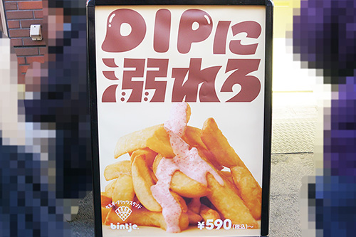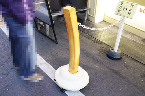 ベルギースタイルフライドポテト専門店「bintje」に、フライドポテトを模したユニークなデザインのポールが設置されていました。根元部分もポテトをソースにディップしたような独特な形状になっています。