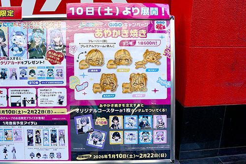 GiGOのたい焼き秋葉原では、期間限定メニューの「牛肉の旨みたっぷりビーフカレー」たい焼きを販売。また、1月10日(土)~2月22日(日)に販売予定の「にじさんじ」コラボたい焼き、「あやかき焼き」の告知も出ていました。