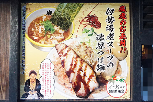 麺屋武蔵 巌虎では、5日までのお正月期間限定で「伊勢海老スープの濃厚つけ麺」が販売されていました。新年を祝うのにふさわしい豪華なメニューとなっています。