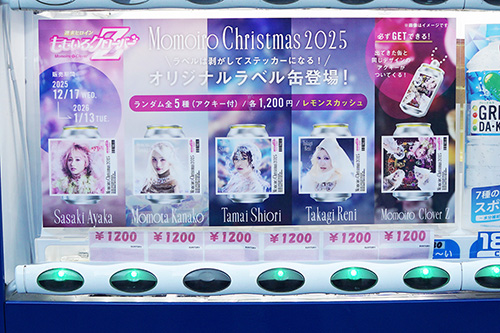 名代 箱根そば 秋葉原店横の自販機では、「週末ヒロイン ももいろクローバーZ」コラボ缶ドリンクが1,200円で販売されていました。中身はレモンスカッシュ味のドリンクで、ラベルがそのままステッカーになります。