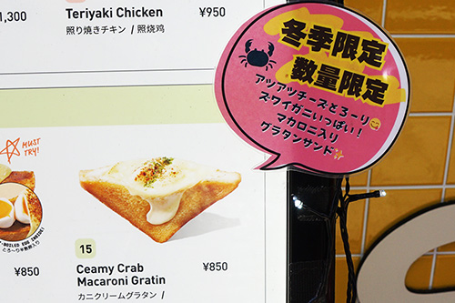 SANDO LAB TOKYO 秋葉原店では、期間限定メニューの「カニクリームグラタンサンド」が販売されていました。