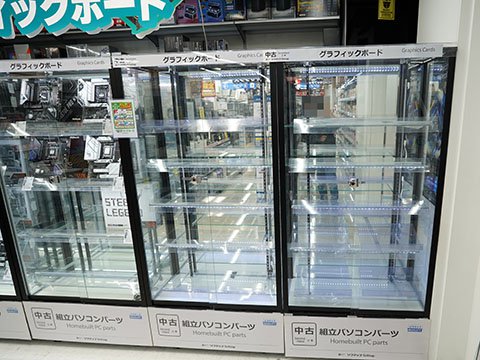 在庫切れの影響は店頭にも見える形で現れており、「ビデオカード陳列用のショーケースを布で覆う」「ぬいぐるみを置く」「同じ商品を複数陳列する」「価格表にイメージ画像を掲示する」など、各ショップは対応に苦慮しているようだ。