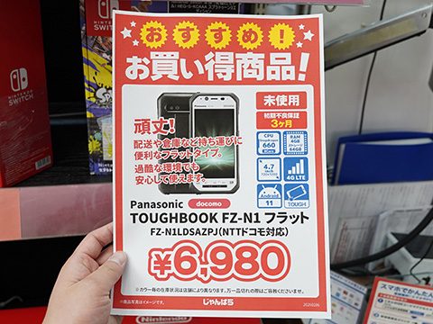 パナソニックのNTTドコモ回線向け高耐久4.7インチAndroidスマートフォン「TOUGHBOOK FZ-N1LDSAZPJ」の未使用品が、じゃんぱら秋葉原5号店とじゃんぱらD-Style秋葉原店で特価販売中。