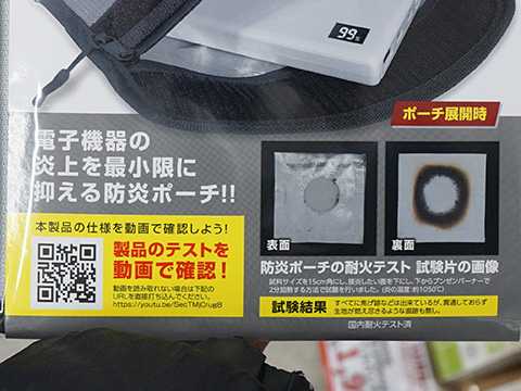 1,000℃のバーナーで2分間加熱する国内耐火テストを実施し、ポーチの素材には耐火性が高く特殊加工された「ガラス繊維布(グラスファイバークロス)」を2重構造で使用しているという。