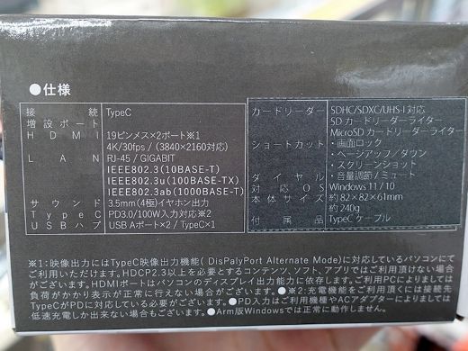 搭載ポートはUSB 3.2 Gen1×3(1基Type-C)、HDMI 2.0出力×2(4K/60Hz、ホストデバイスのDP Alt Mode対応必須)、UHS-I対応SDカード/microSDカードスロット、1000BASE-T LAN、3.5mm音声入出力。最大100W入力対応のPDパススルーUSB Type-Cポートも備える。
