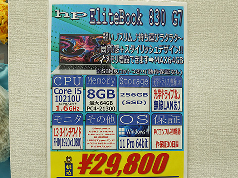Core i5-10210U(4コア/8スレッド)搭載のHP製13.3インチノートPC「EliteBook 830 G7」の中古品が、PCコンフル 秋葉原3号店でセール中。