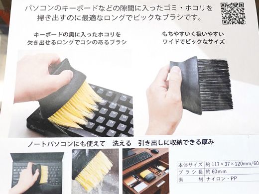 ナイロン・PP製のクリーニングブラシ。60mmのブラシ長でPC用キーボードの清掃に最適としている。