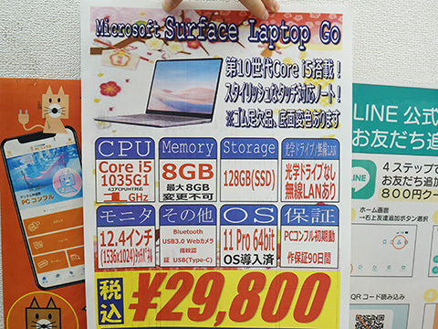 Core i5-1035G1(4コア/8スレッド)搭載の12.4インチノート「Surface Laptop Go」の中古品が、PCコンフル 秋葉原2号店でセール中。