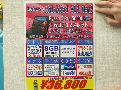 Ryzen 5 Pro 5650U(6コア/12スレッド)搭載の13.3型ノートPC「ThinkPad X13 Gen2」の中古品が、PCコンフル 秋葉原3号店でセール中。