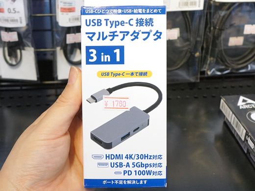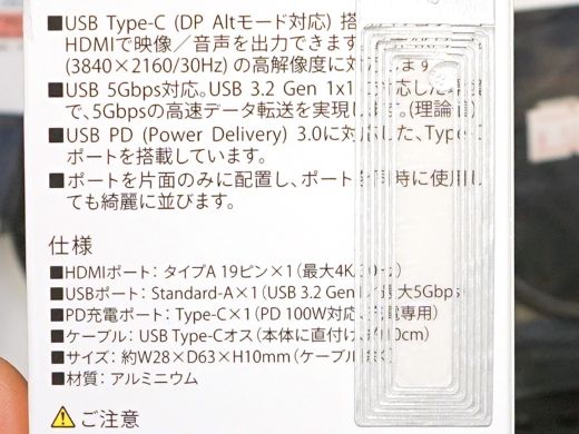 USB 3.2 Gen1接続のドックで、USB 3.2 Gen1 Type-AとHDMI出力を搭載。最大100W対応のUSB PD給電USB Type-Cポートも備える。