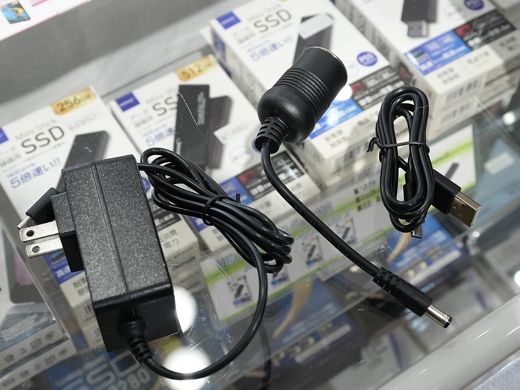 同梱物は専用ACアダプター、シガーライターケーブル、Type-A to Type-Cケーブル、取扱説明書兼保証書。