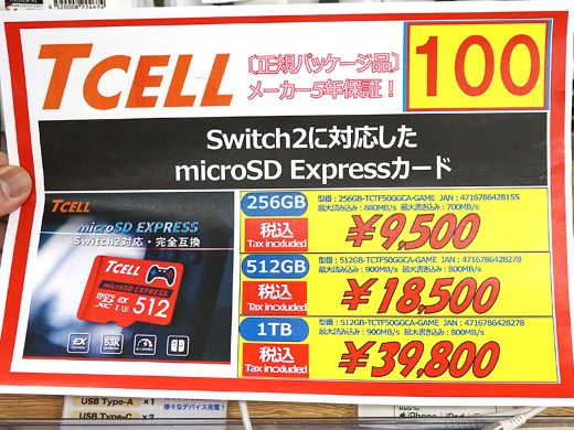 ニュースTCELLのmicroSD Expressカードに256GB/1TBモデル AKIBA PC Hotline!編集部2026年2月3日 09:05 TCELLのmicroSD Expressカードの256GBモデル「256GB TCTF50EGCA-GAME」と1TBモデル「1TB TCTF50GGCA-GAME」が浜田電機に入荷。店頭価格は順に9,500円、39,800円。 転送速度は256GBがリード最大880MB/s、ライト最大700MB/s、1TBがリード最大900MB/s、ライト最大800MB/s。 容量512GBモデルはすでに入荷済み。 [取材協力:浜田電機] Amazon/楽天で購入microSD Express関連製品Amazonで購入楽天で購入