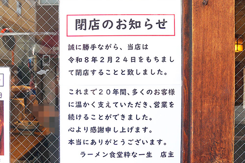 「ラーメン食堂 粋な一生」が2月22日で閉店