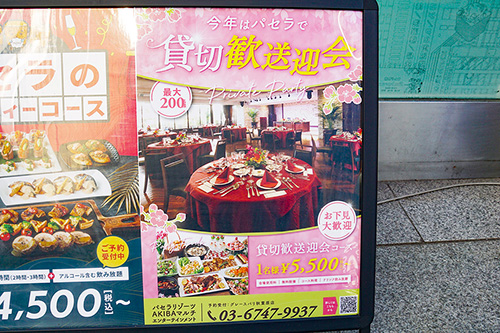 カラオケパセラAKIBAマルチエンターテインメント店では、歓送迎会の季節に向けて貸し切りコースのアピールが行われていました。なんと最大で200名の利用も可能との事です。