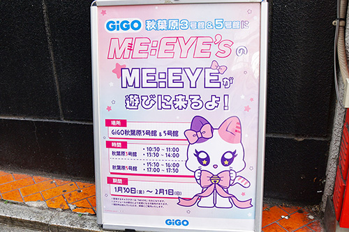 GiGO秋葉原3号館で、アイドルグループ「ME:I」の公式キャラクター「ME:EYE's」の来店イベントが予告されていました(実施は2月1日まで)。