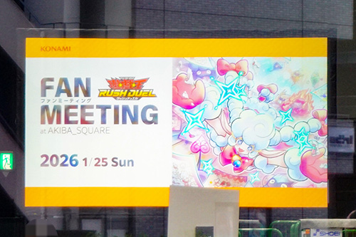 秋葉原UDXの2階AKIBA_SQUAREでは、1月25日開催の「遊戯王ラッシュデュエル ファンミーティング」の準備が行われていました。事前予約抽選制のファンミーティングで、ゲストを招いてのステージイベントや大会などの実施が告知されていました。