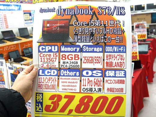 第11世代Core搭載13.3インチノート「dynabook S73/HS」が37,800円!中古PCセール