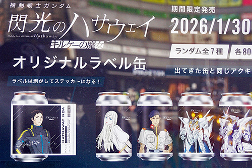 とり鉄 秋葉原昭和通り店横の自販機では、「機動戦士ガンダム 閃光のハサウェイ キルケーの魔女」のコラボオリジナルラベル缶が販売されていました。1本800円で中身はウーロン茶。ラベルがステッカーになる仕様となっています。販売期間は2月26日(木)まで。