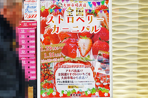 アトレ秋葉原の入り口前では、「全国ストロベリーカーニバル」と題して苺の直売会が行われていました。この位置は人通りも多く、直売を行っているのは稀なので、なかなか珍しい光景となっていました。