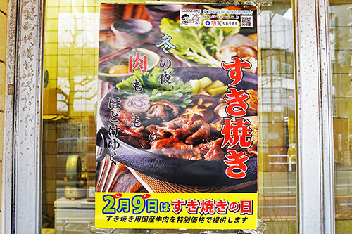 精肉店「石橋」に、「2月9日はすき焼きの日」とすき焼きをアピールする東京都食肉事業協同組合のポスターが貼られていました。