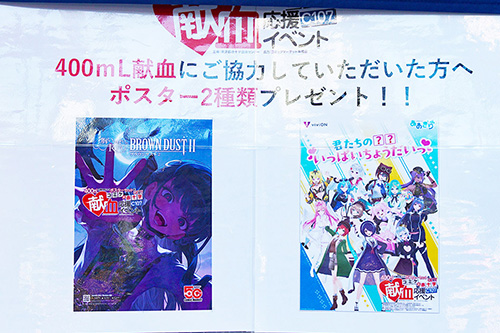 秋葉原UDX サボニウス広場では、献血バス特設会場での献血応援イベントが開催。400mLの献血協力者に「ブランダスト2」や「あおぎり高校」のコラボポスターが配布されていました。
