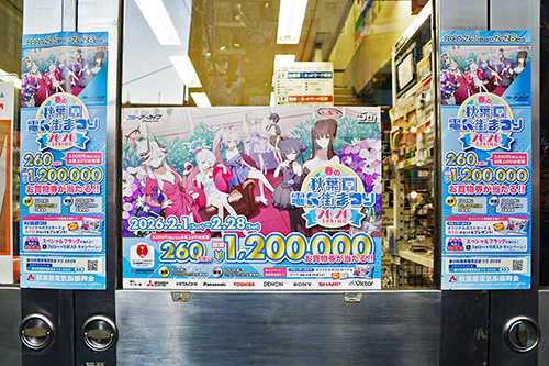 愛三電機では、「春の秋葉原電気街まつり 2026」ポスターが掲載されていました。今回は「ブルーアーカイブ」とのコラボレーションとなっていて、50以上の店舗を対象としたキャンペーンが行われます。開催期間は2月1日(日)~2月28日(土)まで。