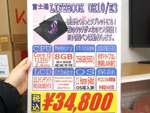 第11世代Core搭載の13.3インチ2in1「LIFEBOOK UH10/E3」が34,800円!訳あり中古PCセール