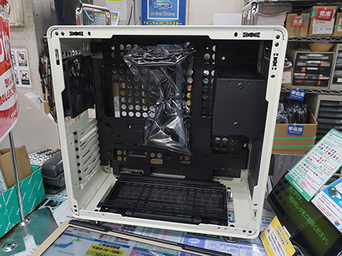 ドライブベイは3.5/2.5インチシャドウ(電源ブラケット上)、2.5インチシャドウ×2。対応ケースファンはフロント/トップ/ボトムが120mm×3または140mm×2(I/Oユニット配置による制限あり)、リアが120mm×1。