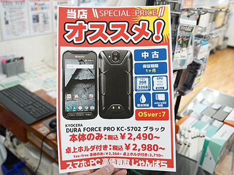 京セラの5インチスマートフォン「DURA FORCE PRO(KC-S702)」の中古品が、じゃんぱら秋葉原5号店で特価販売中です。