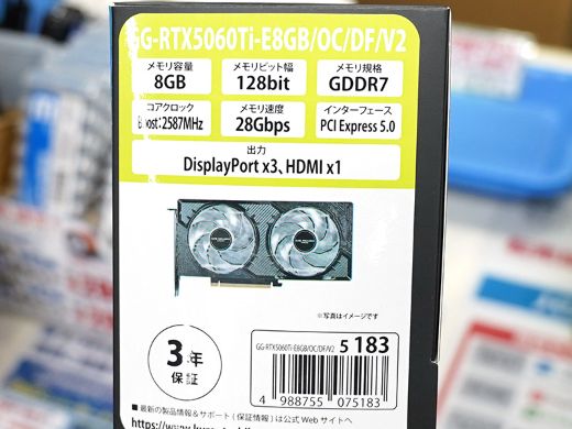 GG-RTX5060Ti-E8GB/OC/DF/V2は、メモリ8GB版のGeForce RTX 5060 Tiを搭載したビデオカード。2025年4月発売の「GG-RTX5060Ti-E8GB/OC/DF」の後継と思われる製品。
