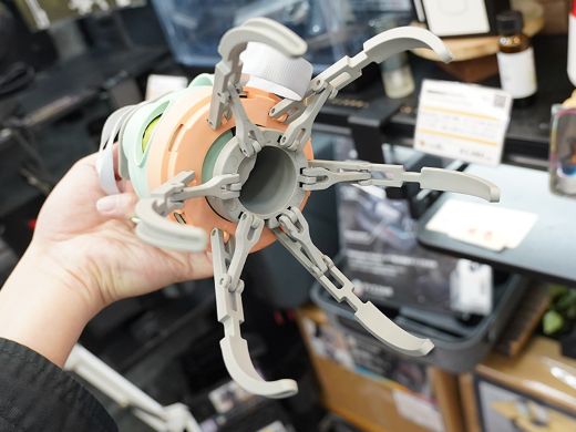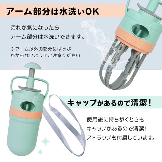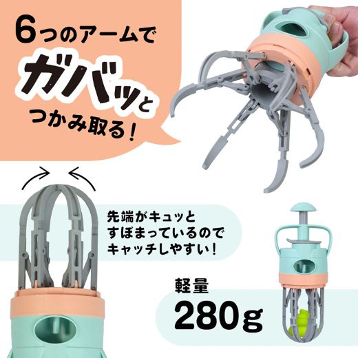 6つのアームを備えたキャッチャーで、袋を被せて使うことで、ペットのフンなど触れたくないものを片手で拾ってゴミ袋に捨てるところまで処理できるというアイテム。
