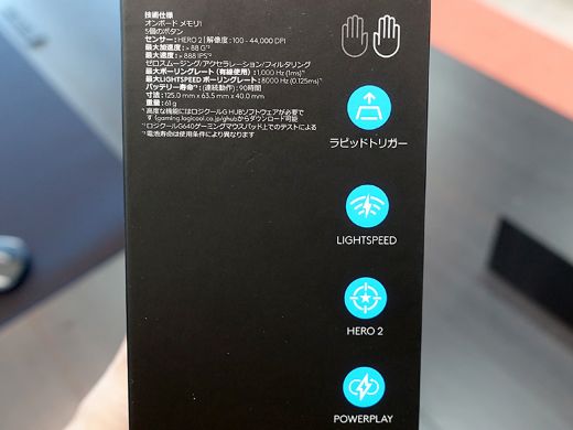 搭載センサーはHERO2光学センサーで、読み取り解像度は100~44,000DPI、最大加速度88G、最大速度888IPS。ポーリングレートはワイヤレス時最大8,000Hz、有線時1,000Hz。同社の無線給電テクノロジー「POWERPLAY 2」にも対応する。