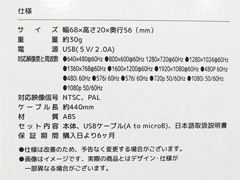 本体サイズは68×56×20mm、重量は約30g。USB電源で駆動する。付属品はUSBケーブル(A to miniB)、日本語取扱説明書。
