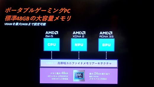 搭載する LPDDR5X-8533メモリの容量は48GBで、最大24GBをVRAMとして割り当てられるため、大規模なAIモデルのローカル実行もサポートするとしている。