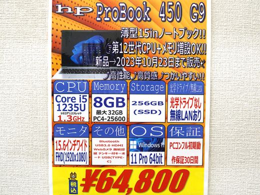 第12世代Core搭載の15.6インチノート「ProBook 450 G9」が64,800円!中古PCセール