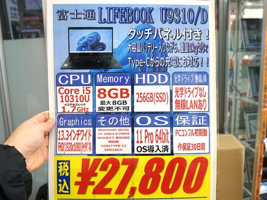 第10世代Coreプロセッサー搭載の富士通製13.3インチノートPC「LIFEBOOK U9310/D」中古品がPCコンフル 秋葉原4号店でセール中。