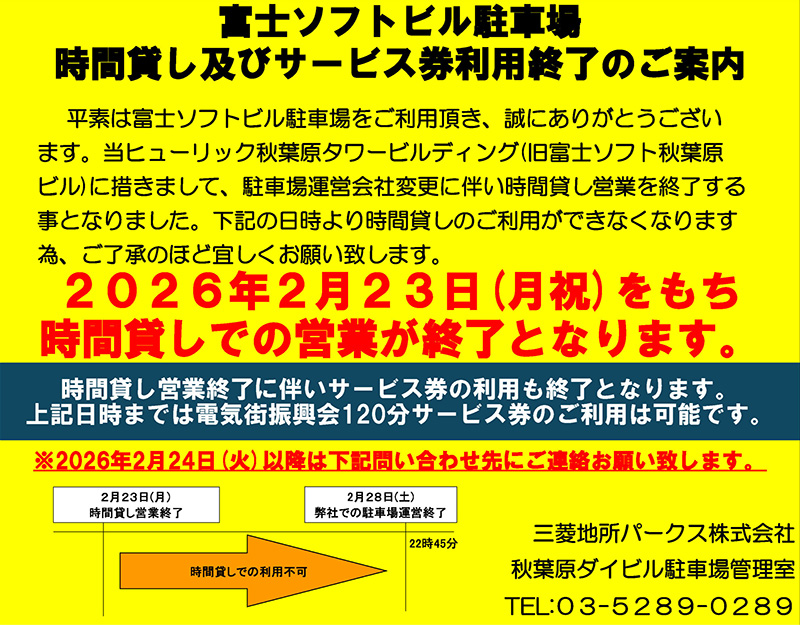 時間貸し営業の終了は運営会社の変更に伴うもので、それに合わせて秋葉原電気街振興会の一部加盟店が発行する駐車場サービス券の同駐車場の利用も、同営業終了日をもって終了となる。