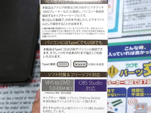 PC接続時は付属の「VHS to DVD 5.0(英語OEM版)」ソフトウェアでデジタル映像として簡単に記録できるという。配信ソフト「OBS Studio」でも動作する。