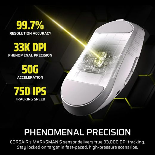マウスセンサーには「MARKSMAN S」センサーを採用。33,000DPIの読み取り解像度と750IPSの速度、50Gの加速度に対応する。