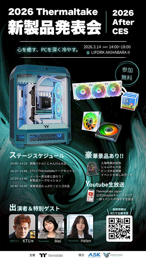 Thermaltakeは、一般来場無料のイベント「2026 Thermaltake 新製品発表会」を3月14日(土)に開催する。