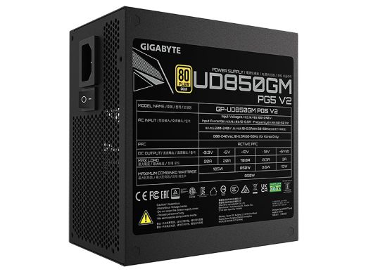 UD850GM PG5 V2は、850W出力のATX 3.1/PCIe Gen 5.1対応電源ユニット。12V-2x6コネクタとネイティブケーブルを備え、80PLUS Gold認証の効率動作をうたう。