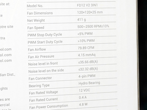 ファンの主な仕様は、回転数が500~2,500RPM(±10%)、風量が79.89CFM、風圧が4.15mmAq、騒音値が最大35.66dBA。サイズは120×120×25mm。
