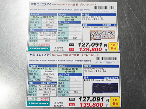 ラインアップは「GeForce RTX 5070 World of Warcraft MIDNIGHT LIGHT EDITION OC」と「GeForce RTX 5070 World of Warcraft MIDNIGHT VOID EDITION OC」の2種類。「数量限定モデル」(TSUKUMO eX.)で、店頭価格は139,800円。