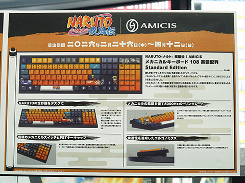 「NARUTO-ナルト- 疾風伝 | AMICIS メカニカルキーボード 108 英語配列 Standard Edition」は、ナルトのイメージカラーを基調に、各里のアイコンを散りばめたポップなキー面デザインを採用したテンキー付きメカニカルキーボード。英語配列モデルで、価格は16,500円。