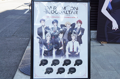音アニ2号店では、「DARK MOON -黒の月:月の祭壇-」のコラボワイヤレスイヤホンの店頭展示・受注販売が行われていました。ONKYOの完全ワイヤレスイヤホン「AOW04」とコラボレーションしたモデルとなっています。