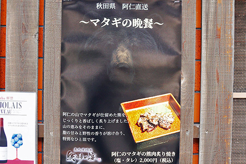 東北居酒屋 奥羽の宴では、阿仁の山でマタギが仕留めたクマを炙り焼きにした「阿仁のマタギの熊肉炙り焼き」が販売されていました。「脂の甘みと野生の香りが溶け合う、特別なひと皿」との事です。