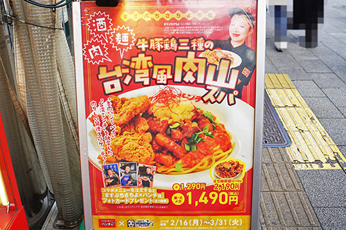 スパゲッティーのパンチョ 秋葉原昭和通り口店では、大食いタレントますぶちさちよさん監修の「肉!麺!酒!これが本気のさちよ盛り 牛豚鶏三種の台湾風肉山スパ」が期間限定で販売されていました。