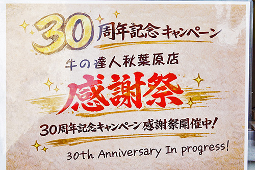 牛の達人秋葉原店では、「牛の達人」ブランド誕生30周年記念キャンペーンとして「感謝祭」を実施。2月28日まで30周年記念・感謝還元メニューや30周年記念コースメニューなどが販売されていました。